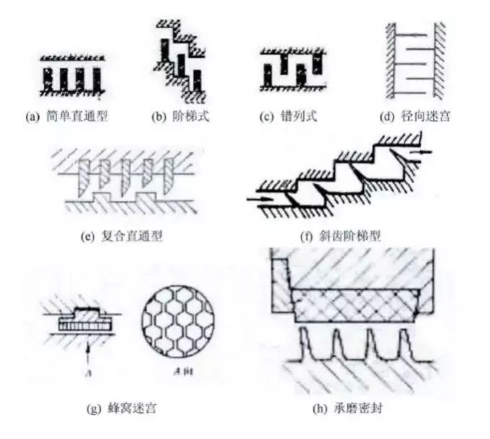 迷宮密封是在轉軸周圍設多個依次排列的環行密封齒,齒與齒之間形成一系列截流間隙與膨脹空腔,被密封介質在通過曲折迷宮的間隙時產生節流效應而達到阻漏的目的,是離心式壓縮機級間和軸端最基本的密封形式,根據結構特點的不同,可分為平滑式、曲折式、階梯式及蜂窩式等四種類型。